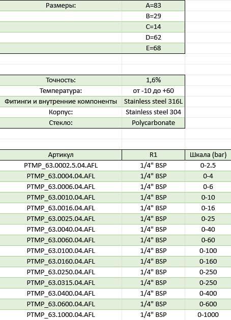 С двойной шкалой bar/psi IP 65a Точность: 1,6% Температура: от -10 до +60 Фитинги и внутренние компоненты Stainless steel 316L Корпус: Stainless steel 304 Стекло: Polycarbonate Размеры: А=83 B=29 C=14 D=62 E=68 Артикул R1 Шкала (bar) PTMP_63.0002.5.04.AFL 1/4" BSP 0-2.5 PTMP_63.0004.04.AFL 1/4" BSP 0-4 PTMP_63.0006.04.AFL 1/4" BSP 0-6 PTMP_63.0010.04.AFL 1/4" BSP 0-10 PTMP_63.0016.04.AFL 1/4" BSP 0-16 PTMP_63.0025.04.AFL 1/4" BSP 0-25 PTMP_63.0040.04.AFL 1/4" BSP 0-40 PTMP_63.0060.04.AFL 1/4" BSP 0-60 PTMP_63.0100.04.AFL 1/4" BSP 0-100 PTMP_63.0160.04.AFL 1/4" BSP 0-160 PTMP_63.0250.04.AFL 1/4" BSP 0-250 PTMP_63.0315.04.AFL 1/4" BSP 0-315 PTMP_63.0400.04.AFL 1/4" BSP 0-400 PTMP_63.0600.04.AFL 1/4" BSP 0-600 PTMP_63.1000.04.AFL 1/4" BSP 0-1000 Технические характеристики товара могут отличаться от указанных на сайте, уточняйте технические характеристики товара на момент покупки и оплаты. Вся информация на сайте о товарах носит справочный характер и не является публичной офертой в соответствии с пунктом 2 статьи 437 ГК РФ.