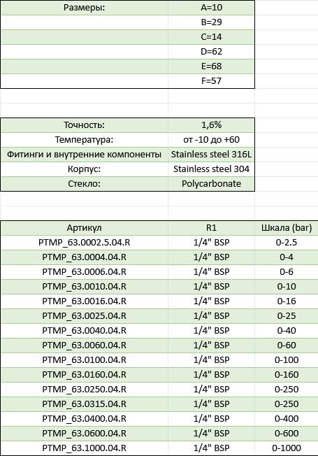 Двойная шкала bar/psi IP 65a Точность: 1,6% Температура: от -10 до +60 Фитинги и внутренние компоненты Stainless steel 316L Корпус: Stainless steel 304 Стекло: Polycarbonate Размеры: А=10 B=29 C=14 D=62 E=68 F=57 Артикул R1 Шкала (bar) PTMP_63.0002.5.04.R 1/4" BSP 0-2.5 PTMP_63.0004.04.R 1/4" BSP 0-4 PTMP_63.0006.04.R 1/4" BSP 0-6 PTMP_63.0010.04.R 1/4" BSP 0-10 PTMP_63.0016.04.R 1/4" BSP 0-16 PTMP_63.0025.04.R 1/4" BSP 0-25 PTMP_63.0040.04.R 1/4" BSP 0-40 PTMP_63.0060.04.R 1/4" BSP 0-60 PTMP_63.0100.04.R 1/4" BSP 0-100 PTMP_63.0160.04.R 1/4" BSP 0-160 PTMP_63.0250.04.R 1/4" BSP 0-250 PTMP_63.0315.04.R 1/4" BSP 0-315 PTMP_63.0400.04.R 1/4" BSP 0-400 PTMP_63.0600.04.R 1/4" BSP 0-600 PTMP_63.1000.04.R 1/4" BSP 0-1000 Технические характеристики товара могут отличаться от указанных на сайте, уточняйте технические характеристики товара на момент покупки и оплаты. Вся информация на сайте о товарах носит справочный характер и не является публичной офертой в соответствии с пунктом 2 статьи 437 ГК РФ.