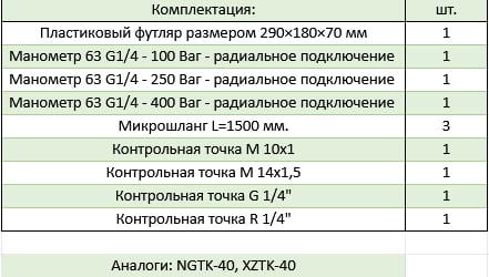 Портативный тестовый комплект манометров – это переносной кейс, укомплектованный приборами для измерения давления. Используются для подключения к любому гидравлическому оборудованию с помощью стандартных резьбовых соединений M16x2 и подходящего микрорукава. Манометры аналоговые произведены из нержавеющей стали, снабжены пружиной Бурдона и заполнены жидкостью (глицерин 99,5%), в соответствии со стандартом DIN 16005. Диаметр Ø 63 мм, размер 320x280xh119мм, с радиальным подключением, точность измерений - 1,6%. Комплектация: шт. Пластиковый футляр размером 290×180×70 мм 1 Манометр 63 G1/4 - 100 Ваг - радиальное подключение 1 Манометр 63 G1/4 - 250 Ваг - радиальное подключение 1 Манометр 63 G1/4 - 400 Ваг - радиальное подключение 1 Микрошланг L=1500 мм. 3 Контрольная точка M 10x1 1 Контрольная точка M 14x1,5 1 Контрольная точка G 1/4" 1 Контрольная точка R 1/4" 1 Аналоги: BDTK-40, NGTK-40, XZTK-40 Технические характеристики товара могут отличаться от указанных на сайте, уточняйте технические характеристики товара на момент покупки и оплаты. Вся информация на сайте о товарах носит справочный характер и не является публичной офертой в соответствии с пунктом 2 статьи 437 ГК РФ.