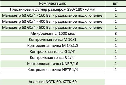 Портативный тестовый комплект манометров – это переносной кейс, укомплектованный приборами для измерения давления. Используются для подключения к любому гидравлическому оборудованию с помощью стандартных резьбовых соединений M16x2 и подходящего микрорукава. Манометры аналоговые произведены из нержавеющей стали, снабжены пружиной Бурдона и заполнены жидкостью (глицерин 99,5%), в соответствии со стандартом DIN 16005. Диаметр Ø 63 мм, размер 320x280xh119мм, с радиальным подключением, точность измерений - 1,6%. Комплектация: шт. Пластиковый футляр размером 290×180×70 мм 1 Манометр 63 G1/4 - 160 Ваг - радиальное подключение 1 Манометр 63 G1/4 - 400 Ваг - радиальное подключение 1 Манометр 63 G1/4 - 600 Ваг - радиальное подключение 1 Микрошланг L=1500 мм. 3 Контрольная точка M 10x1 1 Контрольная точка M 14x1,5 1 Контрольная точка G 1/4" 1 Контрольная точка R 1/4" 1 Контрольная точка UNF 7/16 1 Контрольная точка NPTF 1/4 1 Аналоги: BDTK-60, NGTK-60, XZTK-60 Технические характеристики товара могут отличаться от указанных на сайте, уточняйте технические характеристики товара на момент покупки и оплаты. Вся информация на сайте о товарах носит справочный характер и не является публичной офертой в соответствии с пунктом 2 статьи 437 ГК РФ.