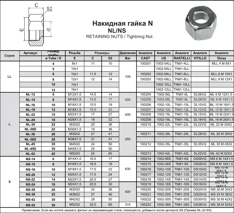 Примечание. Если вы хотите заказать фитинг из нержавеющей стали, пожалуйста, добавьте после артикула SS (Пример NL-22-SS) NLL-8, NLL-10 (D5), NLL-10 (D6), NLL-12, NLL-14, NLL-16, NL-12, NL-14, NL-16, NL-18, NL-22, NL-26, NL-30, NL-30D, NL-36, NL-36D, NL-45, NL-45D, NL-52, NS-14, NS-16, NS-16, NS-20, NS-22, NS-24, NS-30, NS-36, NS-42, NS-52 100201, 100202, 100203, 100204, 100205, 100206, 100207, 100208, 100209, 100210, 100211, 100212, 100213, 100214, 100215, 100216, 100217, 100218, 100219, 100220, 100221, 100222, 100223 TN81-4LL, TN81-5LL, TN81-6LL, TN81-8LL, TN81-10LL, TN81-12LL, TN81-6L, TN81-8L, TN81-10L, TN81-12L, TN81-15L, TN81-18L, TN81-22L, TN81-28L, TN81-35L, TN81-42L, TN81-6S, TN81-8S, TN81-10S, TN81-12S, TN81-14S, TN81-16S, TN81-20S, TN81-25S, TN81-30S, TN81-38S DL06VG, DL08VG, DL10VG, DL12VG, DL15VG, DL18VG, DL22VG, DL28VG, DL35VG, DL42VG, DS06VG, DS08VG, DS10VG, DS12VG, DS14VG, DS16VG, DS20VG, DS25VG, DS30VG, DS38VG