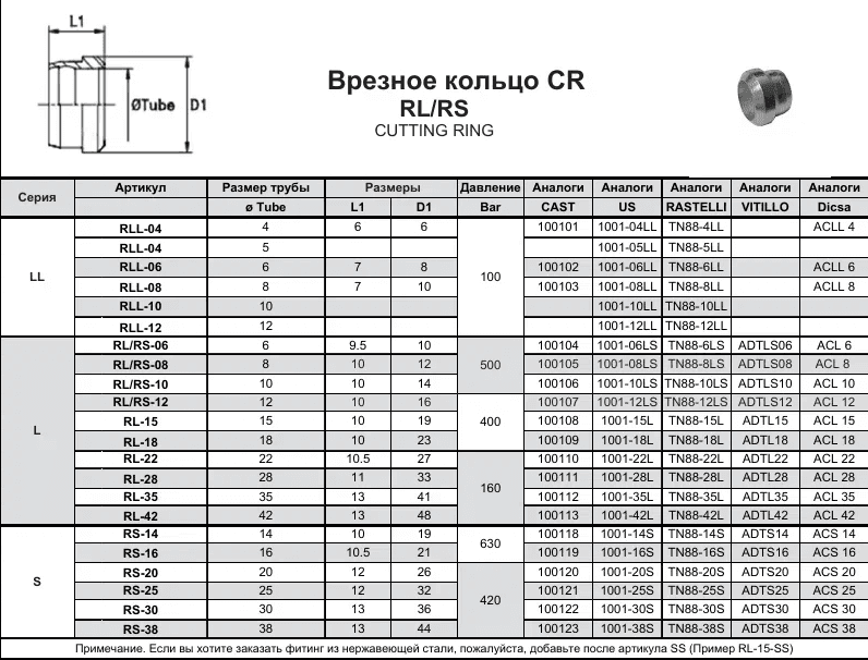 Примечание. Если вы хотите заказать фитинг из нержавеющей стали, пожалуйста, добавьте после артикула SS (Пример RL-15-SS) RLL-04, RLL-04, RLL-06, RLL-08, RLL-10, RLL-12, RL/RS-06, RL/RS-08, RL/RS-10, RL/RS-12, RL-15, RL-18, RL-22, RL-28, RL-35, RL-42, RS-14, RS-16, RS-20, RS-25, RS-30, RS-38. 100101, 100102, 100103, 100104, 100105, 100106, 100107, 100108, 100109, 100110, 100111, 100112, 100113, 100118, 100119, 100120, 100121, 100122, 100123 TN88-4LL, TN88-5LL, TN88-6LL, TN88-8LL, TN88-10LL, TN88-12LL, TN88-6LS, TN88-8LS, TN88-10LS, TN88-12LS, TN88-15L, TN88-18L, TN88-22L, TN88-28L, TN88-35L, TN88-42L, TN88-14S, TN88-16S, TN88-20S, TN88-25S, TN88-30S, TN88-38S. ADTLS06, ADTLS08, ADTLS10, ADTLS12, ADTL15, ADTL18, ADTL22, ADTL28, ADTL35, ADTL42, ADTS14, ADTS16, ADTS20, ADTS25, ADTS30, ADTS38.